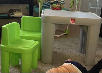 Chairs tuck in under the table. Good size table for little ones to play with table top toys and do art activities.