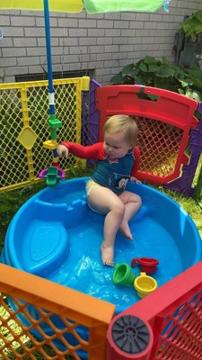 My 2 year old loves this pool! And I love that he is shaded and has so much fun in it! We didn’t add a ton of water because we just wanted him to be able to stay cool while we were having a yard sale. But my son was so happy to play with the cups and watching the water go through and spin the gear.