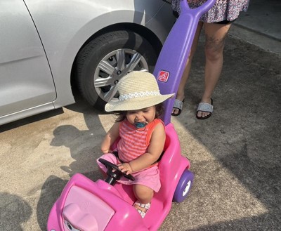 Super cute!! Easy to turn although if you need to make big u-turns, you have to lift it (it doesn’t steer from the handle). But, really easy to use, steering hasn’t been a problem, it’s really light, my daughter loves it & the seat belt is great. Storage is nice too for her little snacks and water bottle