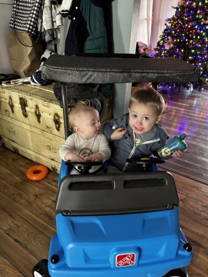 The side by side push around SUV is a delightful ride for young children, offering a smooth and quiet experience. Guests appreciate its spacious design, which accommodates two kids comfortably, and the added storage for snacks and toys. The product is easy to maneuver, making it perfect for neighborhood walks and outdoor adventures. However, some guests noted challenges with assembly and limited legroom for taller children, suggesting a need for careful consideration of age and size.