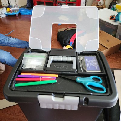 Features an easy-access, in-lid compartment, and divided sections that provide extra room for your pens, scissors, calculator, notepad, and other small things. The lid locks into place with the titanium gray latches, keeping everything sealed inside. Also, the clear lid makes it easy to check its contents without showing everyone what's inside. With a top handle design, you can easily transport and carry these boxes. Stackable, and allows for efficient use of vertical space thanks to indexed cover design.
