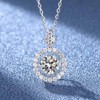 This moissanite halo pendant necklace features a 1 carat round cut center stone surrounded by smaller accent stones. The setting and chain are crafted from 925 sterling silver with five-layer platinum plating, offering durability and a refined finish. Designed with a minimalist pendant style, it is lightweight and comfortable for both daily wear and formal occasions.