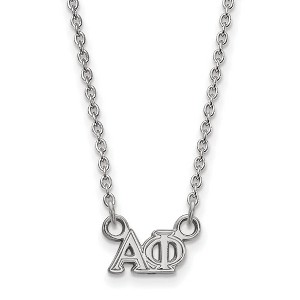 - Unique Features - Show your greek life spirit with this Alpha Phi Sorority necklace. It is crafted with rhodium plated sterling silver and is 18 Inches in length. The pendant is 6mm in width and 9mm in height (0.24 in x 0.35 in) and dangles from a 1.25mm wide cable chain. We are a certified Collegiate jewelry retailer and this authentic item is licensed by the Alpha Phi Sorority and Greek Life. This pendant necklace is made the USA.