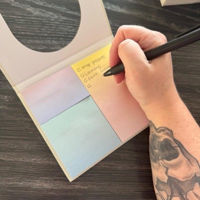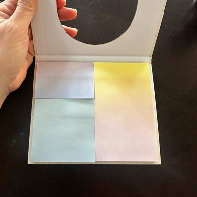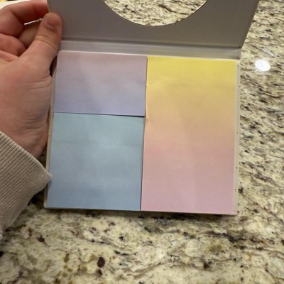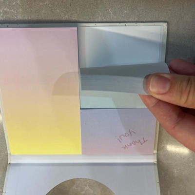 [This review was collected as part of a promotion.] This is a book of sorts that upon opening there are three different types of sticky notes in it as you can see. These are really pretty sticky notes and can easily be used for many purposes. I love the color changing through the stickies and the various sizes included to fit your needs. This is a really cool way to keep sticky note pads.