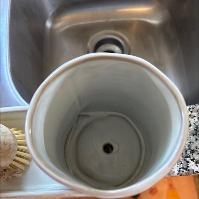 submitted byPeggy - 10 months agoA: Hi Sadie Suede - Thank you for your interest in the Stoneware Kitchen Sink Caddy Sour Cream. The cup end has a drainage hole with a plug, to help prevent leaks. Happy shopping! - Emma