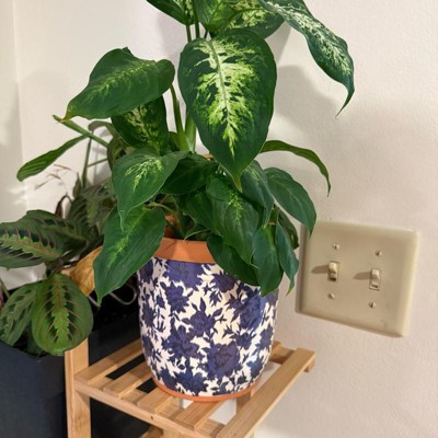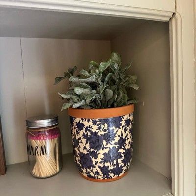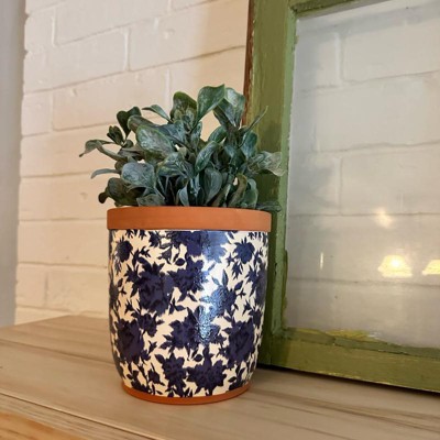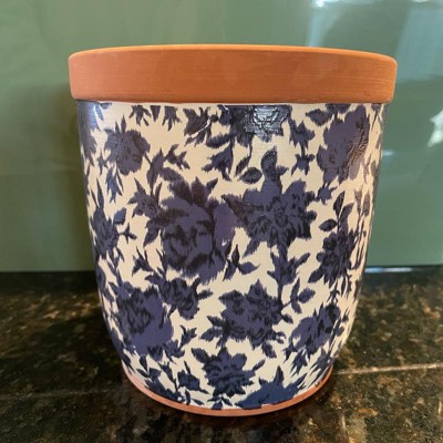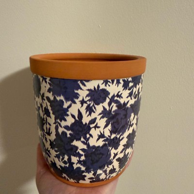 [This review was collected as part of a promotion.] This beautiful, floral planter is the perfect size to accent mini places in your house. It can take live plants because it has a drain hole at the bottom but can also be plugged. The floral pattern is a little abstract but perfect to fit with mini decor options. It is a darker blue with some navy accent pieces and then a cream background.