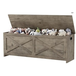 47.3-inch washed grey MDF storage ottoman with reinforced straight double X-legs for superior stability. It combines comfortable seating and large hidden storage, ideal for storing pillows, blankets and sundries, suitable for living rooms and entryways.