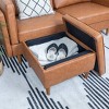- Plywood and solid wood frame upholstered in cognac colored vegan leather with fabric lined storage compartment and solid wood legs