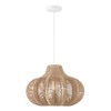 - This modern boho ceiling light showcases a woven paper rope shade hung from a white metal canopy