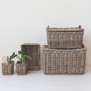 - A gorgeous set of five trunks and baskets made of natural hand-woven rattan, featuring a rectangular design, a lid, and handles for easy carrying