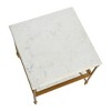 The Libertine collection showcases timeless pieces crafted to withstand any home refresh. This substantial square end table features a genuine white marble top with unique variations and character, making each piece one-of-a-kind. Inspired by French cafe culture, the heavy iron legs, underframe frame, and cross brace in gold finish add a touch of sophistication to any space. The ogee edge marble top is particularly well-suited for French country, art deco, transitional, and even antique Victorian aesthetics. This piece assembles in minutes with no tools required, making it easy to add a touch of elegance to any room. Measuring at 24 inches long, 24 inches wide, and 25 inches high, this bedside table is both sturdy and functional.