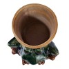 This green, white, and brown stoneware frog planter is a fun and quirky way to display plants. The planter features a stoneware frog with a round body and a smiling face that brightens up any space. The planter does not have any drainage holes, so it is suitable for artificial plants or succulents that do not require much water. The planter is made of sturdy and durable stoneware with a reactive glaze finish that creates a unique and variegated look. The vase measures 5.25 inches in diameter, and 5 inches tall and can hold a 4-inch pot. This planter is great for adding some color and character to any garden, patio, or porch.