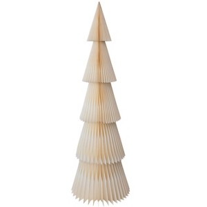 Transform every holiday decor with this charming and elegant Handmade Paper Folding Tree. Boasting a stunning honeycomb design creates a beautiful play of light and shadow that captivates guests. The subtle gold glitter edge adds a festive shimmer, elevating the piece's overall elegance. Crafted from vibrant white paper, it offers a clean and classic aesthetic, making it a perfect fit for any holiday setting. This unique and eye-catching tree is bound to impress and will help set a warm and inviting atmosphere throughout the holiday season. It measures 23 inches in diameter and stands 72 inches tall.