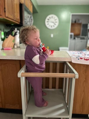 We did endless research on which learning tower to buy and we’re so glad we got Storkcrafts. Our daughter loves hanging out in it while we’re in the kitchen. Even though the height is adjustable, the default position is perfect out of the box and lets our daughter play and feel on the kitchen counter along with us. So glad we made this purchase, and the sage color is beautiful!