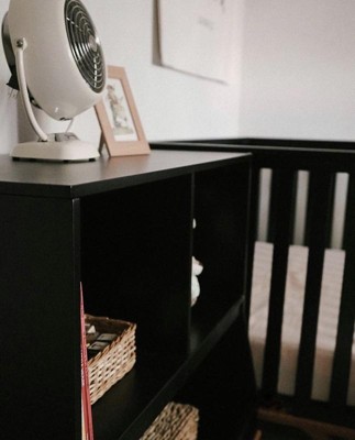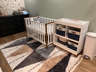 Received as a generous gift along with the matching crib and couldn’t be happier! The table is sleek enough to fit in our nursery right next to the crib, which makes changing and middle-of-the-night feeds so much easier! The slots are great and I easily found awesome baskets to slide in and complete the look. The lowest shelf is deep and can store all our activity and play mats as well as crib sheets and stuffed animals, so it’s ideal for nursery where you need that extra space separate from clothing dressers.