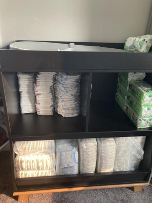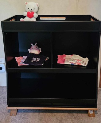 [This review was collected as part of a promotion.] This changing table is a nice sturdy piece. It makes a great addition to any nursery. The storage underneath and extremely expansive and spacious. You can really fit a lot of your essentials in there! The color of this changing table is a sleek black with cherry wood legs. The design is contemporary and easily blends in. The structure is sturdy and smooth. It is easy to clean too. The one concern I have is that the top frame for the changing table is only secured in the back of the changing table which makes it luggable only the front. This hasn’t posed any issues but it something I have noticed.