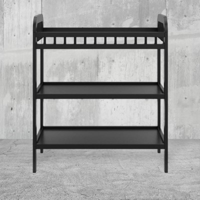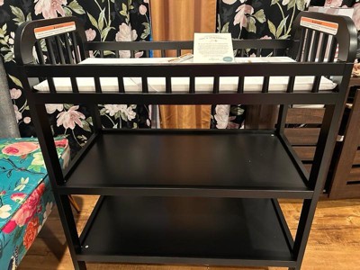 [This review was collected as part of a promotion.] This changing table is so adorable! I love the 2 shelves underneath and use it for diapers and wipes. I really like the dark wood color and flows nicely with the rest of our furniture. It's sturdy and the little pad is just enough to add a little comfort. It makes changing a diaper easy while standing, I don't have to slouch over very much at all. Thank you!!