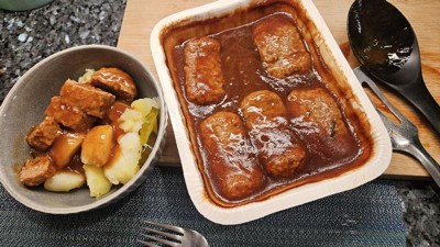 [This review was collected as part of a promotion.] Good meal for one person....appearance is very good and its delicious..very good seal and the meat is juicy...mash potatoes texture is good also