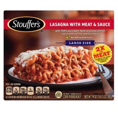 - FRESHLY MADE, SIMPLY FROZEN: With Stouffer’s frozen dinners in your freezer, you’ll always be ready to serve up something delicious -- no additional ingredients required. Keep this meat lasagna frozen until you’re ready to cook and serve
