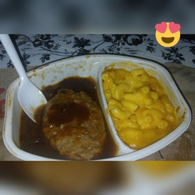 [This review was collected as part of a promotion.] Surprising this meal is actually good. The mac & cheese is actually very good really cheesy. The Salisbury is charbroiled flavored and light. It heats well.