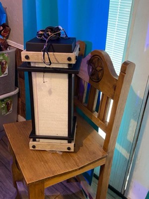 - Matte black finish features grey wood accents for a farmhouse vibe
