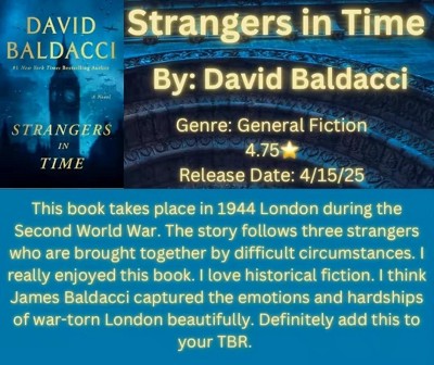 This book takes place in 1944 London during the Second World War. The story follows three strangers who are brought together by difficult circumstances. I really enjoyed this book. I love historical fiction. I think James Baldacci captured the emotions and hardships of war-torn London beautifully. Definitely add this to your TBR.