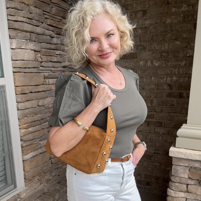 [This review was collected as part of a promotion.] Stylish and cute suede studded bag. This bag is a nice camel color with cute studded rhinestones on the side. It is quite larger than I anticipated so I will be returning it for a little something smaller. Overall, it is a wonderful bag. If you were looking for a bag that is a bit bigger. It will pair well with any outfit since it’s a neutral tone. It’s definitely giving a fall vibe to me. I received an incentive to write this review.