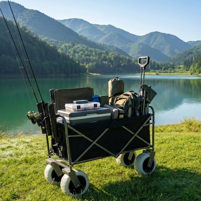 Very sturdy wagon with smooth all-terrain wheels. Perfect for camping, outdoor activities, and groceries. It holds a lot of weight and is easy to fold up and store. Highly recommend!