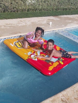 [This review was collected as part of a promotion.] This thing is huge big enough for at least two people its easy to air up easy to maintain its super hevey duty it has bright colors and smooth texture