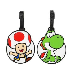 Power up your travel gear with this Super Mario Bros 2-pack luggage tag set. One tag features Toad inside a white circle, while the other showcases Yoshi in a matching design. Made with molded rubber, these tags are fully bendable and come with a strap and metal buckle for secure attachment. Each tag measures 4" x 3.5" and wipes clean easily, making them perfect for any Nintendo fan on the go.