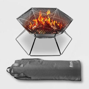 Set up the SOL Flat Pack Fire Pit with ease for a bonfire or barbecue. The hexagonal design provides a sturdy set-up on any terrain with vents in the spacious base for improved air flow. The removable, food-grade grill top is large enough to feed the whole family and is dishwasher safe. Fold up and pack in the included bag featuring an adjustable shoulder strap, and room for extra gear or and fuel. Designed for use with wood, charcoal, and other biofuels. Extend the shoulder seasons or use all year round, the SOL Flat Pack Fire Pit is portable, durable, and ready for adventure.