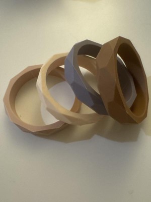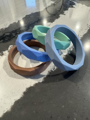 These silicone teethers for my dog are great. My wife can fit them on her wrist when we are out for a walk or at the dog park, so easily carried if needed. They did not fit on my wrist, so i would need to keep them in a bag if i were going out with them. My dog loves to chew on them and has been walking them around the house. I like that they are made of food grade silicone, so great for my dog. I can also throw them in the dishwasher to clean, which i love.