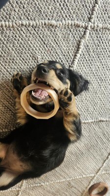 I like the concept of these wearable chew toys. My little dog (18lbs) enjoys them. They’re the perfect size for her to hold them in her paws. However, my GSD got a hold of one of the rings and destroyed it immediately.