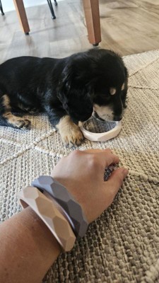 With a 9 week old pup everything seems to be fair game for her to chew on. Thankfully she loves chewing on these adorable bracelets. They are super durable so even her sharp little puppy teeth haven't managed to break one yet. They are super convenient to wear when out and about with our pup and she feels the urge to chew, plus they are super cute!
