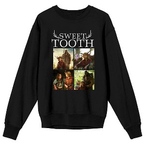 Celebrate your favorite fantasy series in comfort with this Sweet Tooth sweatshirt. The shirt features four square screenshots with images of Gus, Jepperd, and Bear while white letters above the images spell out the series logo. The sweatshirt comes in a black long sleeve crew neck. Sweet Tooth fans will love this comfy and cozy sweatshirt.