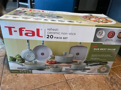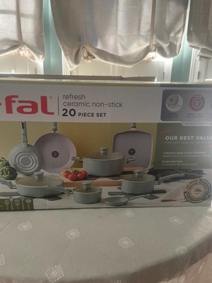 Add a touch of color and style to your kitchen with the new T-fal Refresh Ceramic 12 piece cookware set! Crafted from 100% recycled aluminum body (48% of the product’s total weight), our pots and pans help reduce your eco-impact while offering long-lasting durability and performance. The ceramic nonstick interior ensures easy food release with little to no oil for healthier cooking. This set also features T-fal's Thermo-Spot™ Technology, our unique heat indicator that turns solid red when the pans are perfectly preheated, so you can cook with confidence. The even heat base prevents hot spots for consistently delicious results and is compatible with all cooktops, except induction. Enjoy everyday cooking with the Refresh Ceramic Cookware Collection!