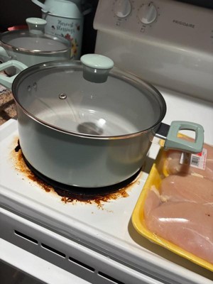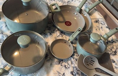 [This review was collected as part of a promotion.] I received the T fal Refresh Ceramic Non Stick 12 Piece Cookware Set in Mint Green from Influenster to try, and I’m really impressed by how this stylish, eco friendly set combines fast, even heating thanks to its recycled aluminum build with a safe, PTFE and PFOA free ceramic non stick coating that makes cooking and cleanup effortless; the Thermo Spot heat indicator helps me know exactly when the pan is perfectly preheated, while the soft touch, stay cool handles provide comfort and control during cooking, and the comprehensive set including 8 inch and 10.5 inch frypans, 1 quart and 2 quart saucepans with lids, a spacious 5 quart Dutch oven, handy utensils, and a silicone trivet covers all my everyday needs beautifully, making it an ideal all in one, eye catching, easy to use cookware upgrade that offers outstanding value, vibrant design, reliable non stick performance, and user friendly features, though it does require gentle hand washing to preserve the coating and isn’t compatible with induction cooktops.