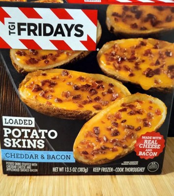 - One 13.5 oz box of TGI Fridays Frozen Appetizers Loaded Cheddar & Bacon Potato Skins, containing about 4.5 servings