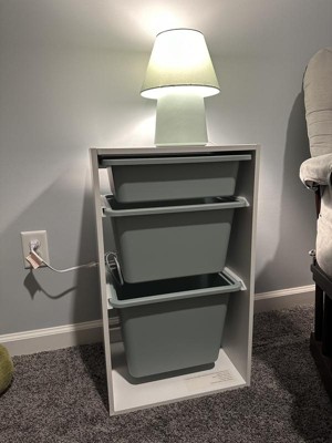 This is a super cute mini lamp and pairs perfectly with the multi-bin storage in the same color also by Pillowfort. I would call it a light sage green. The base is just a little darker than the shade so it gives a little dimension to the lamp. I love the switch is a toggle and easy to flip on and off. This is perfect for next to a glider or arm chair in a baby’s room. The base of the lamp is porcelain so probably not ideal in a playroom unless it’s out of a child’s reach.