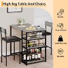 - The ultimate small-space solution! Two bar chairs tuck completely under the table, freeing up precious floor space. Three large storage shelves are perfect for keeping dinnerware, snacks, and linens organized and within easy reach.