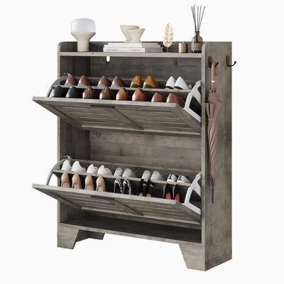 - Maximize every inch of your home! At just 13.8 inches width, this slim cabinet is a storage powerhouse for tight spaces. It combines flip-down drawers for daily shoes, a top for decor, side hooks for keys, and a raised base for slippers.