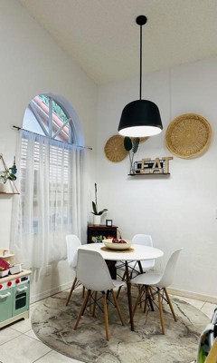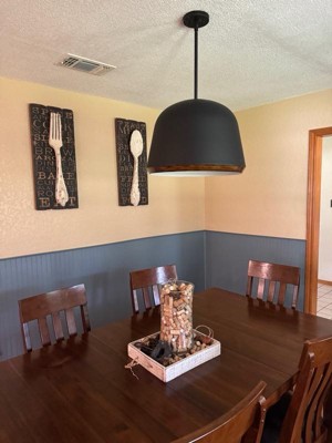 [This review was collected as part of a promotion.] I was nervous about the size using it as a kitchen table light but it’s honestly perfect. We have a dimmer which also helps with the size too so it’s not so harsh. The brown texture on the bottom lip matches my kitchen table stain perfectly which was a pleasant surprise. We have more of a modern farmhouse-ish look to our home and the Matte black and brown accent looks great with our stainless, white uppers, grey bottoms, and farmhouse sink.