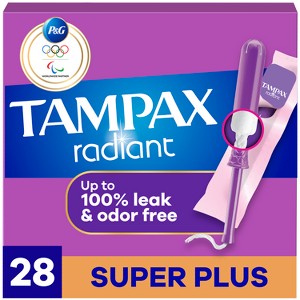 Don't settle for less when you could get more. Experience a no-see, no-feel* period experience with Tampax Radiant (*when inserted correctly). Get up to 100% leak and odor free protection with Tampax Radiant tampons designed with a LeakGuard Braid to help stop leaks before they happen. Plus, Tampax Radiant has a comfort grip for precise and comfortable insertion. Tampax Radiant tampons have a CleanSeal Wrapper for quiet and easy disposal. Tampax Tampons are made with body safe** ingredients. Choose from four absorbencies to match your changing flow. Leaking? Go up an absorbency. Uncomfortable to remove? Go down an absorbency. Tampax Radiant Tampons have a smooth comfort layer for easy removal, even on your light days. Tampax Tampons are made without perfume. Plus, Tampax products are OEKO TEX standard 100 certified, meaning they are tested for up to 1,000 harmful substances (Certificate #24.HUS.14474). Ready to ditch the leaks? Get incredible protection with Tampax, the #1 tampon brand recommended by U.S. Gynecologist (based on 2024 survey). Discover your perfect flow combo and get the protection you need. **All materials meet FDA Medical Device biocompatibility criteria and are safe when used as intended. HOW TO INSERT A TAMPON: Slowly insert the tampon applicator from the tip, all the way to the grip, then push the pusher. After you've pushed the pusher in all the way, pull the applicator out. How to remove a tampon: You'll use your thumb and finger to grip the string and pull it slowly out. Properly dispose of your tampon in the trash.