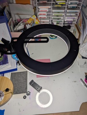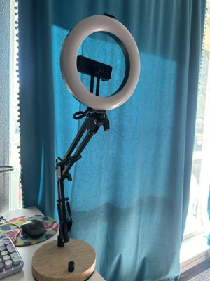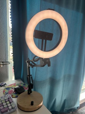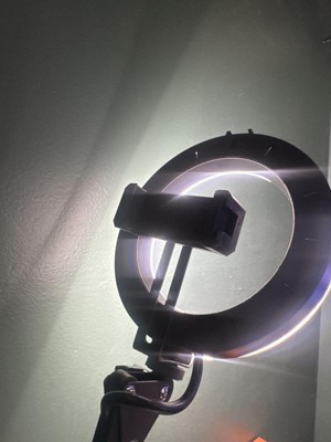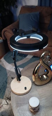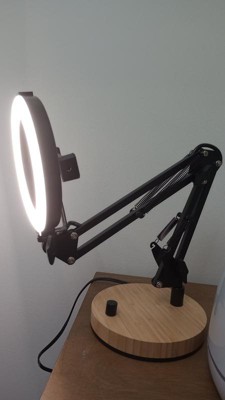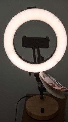 The Threshold LED Ring Light Task Lamp is very functional and has two light settings (white & soft), both dimmable, neither bright. There are lots of positions that are offered by this lamp. Only issues are the teeny tiny instruction "manual" and brightness. Hola phones well.