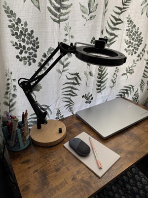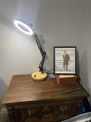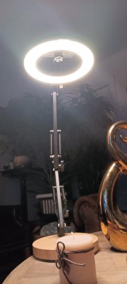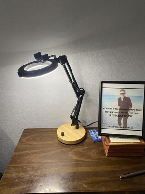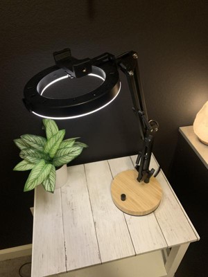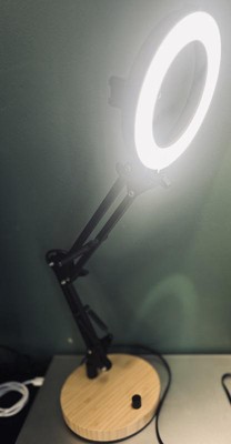 Very impressed with the functionality and design of this task lamp. I love the overall look of the wooden base with the black stand. The stand is adjustable in three places with knobs to tighten to keep it in the position you choose. There is also a dimmer knob to adjust the lighting - low light, normal light, warm orangish glow to bright fluorescent. The ring light also has a built in phone clip which is perfect for filming. Amazing quality! Thank you!