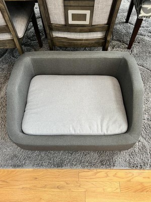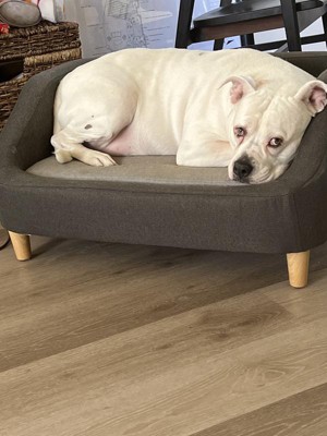 - INCLUDED: One raised pet sofa bed for small and medium dogs with removable cushion in heathered gray linen-style upholstery.