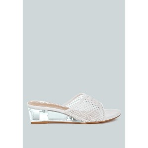 Give your footwear collection a stylish upgrade with these exquisite slip-on sandals. Designed with a rhinestone-studded mesh upper and clear wedge heels, they bring just the right amount of sparkle. Perfect for parties, weddings, or even pairing with your favorite casual looks. Type: Wedges Upper Material: Mesh Outer Sole: TPR Open Round Toe Rhinestone Embellishments Clear Wedge Fantasy Heel Plush Cushion Insoles Slip-On Style Heel Height: 2 inches SH5383