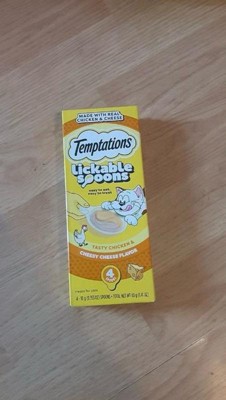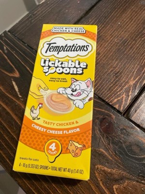 - 4-Pack: Contains four (4) 10-gram spoons of Temptations Lickable Spoons Tasty Chicken and Cheesy Cheese Flavor Adult Wet Cat Treat