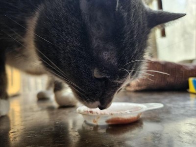 Winnie loves the lickable cat treat. Setting the lickable on a spoon rest or in a clean bowl, Winnie licks the her favorite flavor of chicken and cheese.