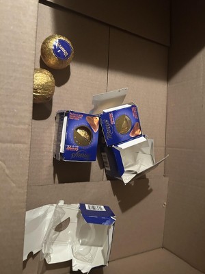 Received 4 boxes, wasn't cheap. Opened a big box to find the two of the four boxes were open and the chocolate balls we're rolling around the box. Box ripped